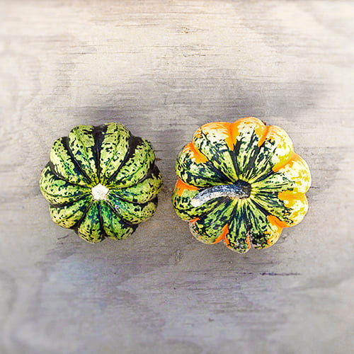 Visually striking with deep ribs of orange and green, this winter squash is a cross between Acorn and Sweet Dumpling Squash. Carnival Squash taste slightly nutty and sweet with a soft texture. Prepare it similar to Acorn Squash.