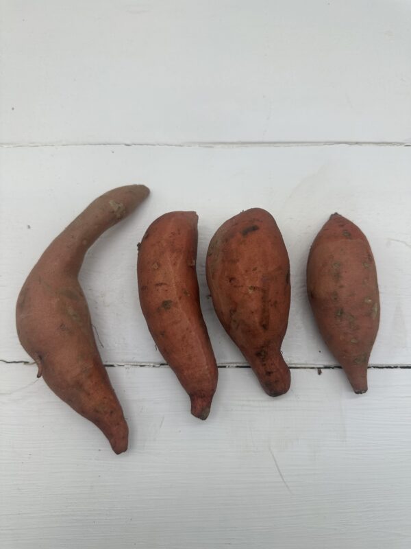Classic sweet potato with red skin and sweet orange flesh, but small sized, resembling a fingerling potato.